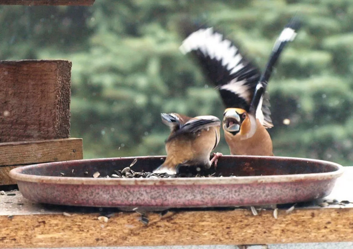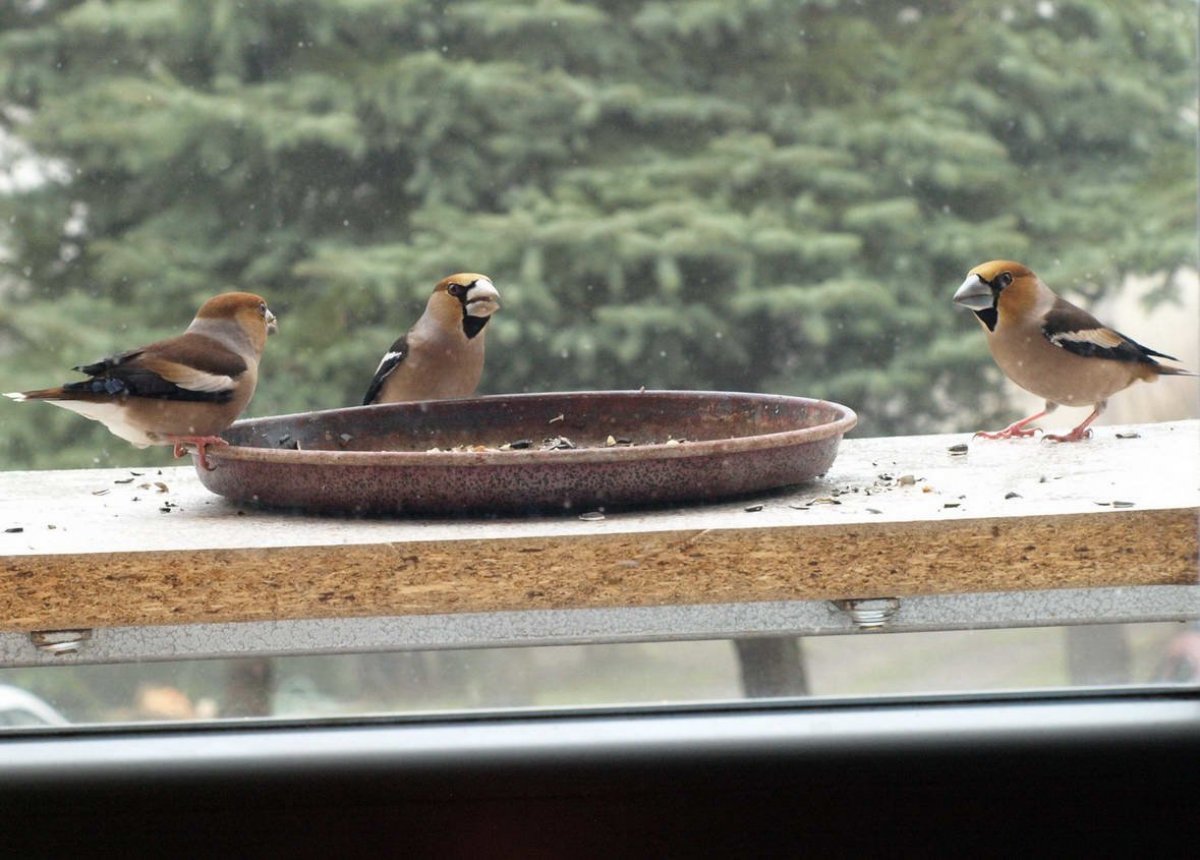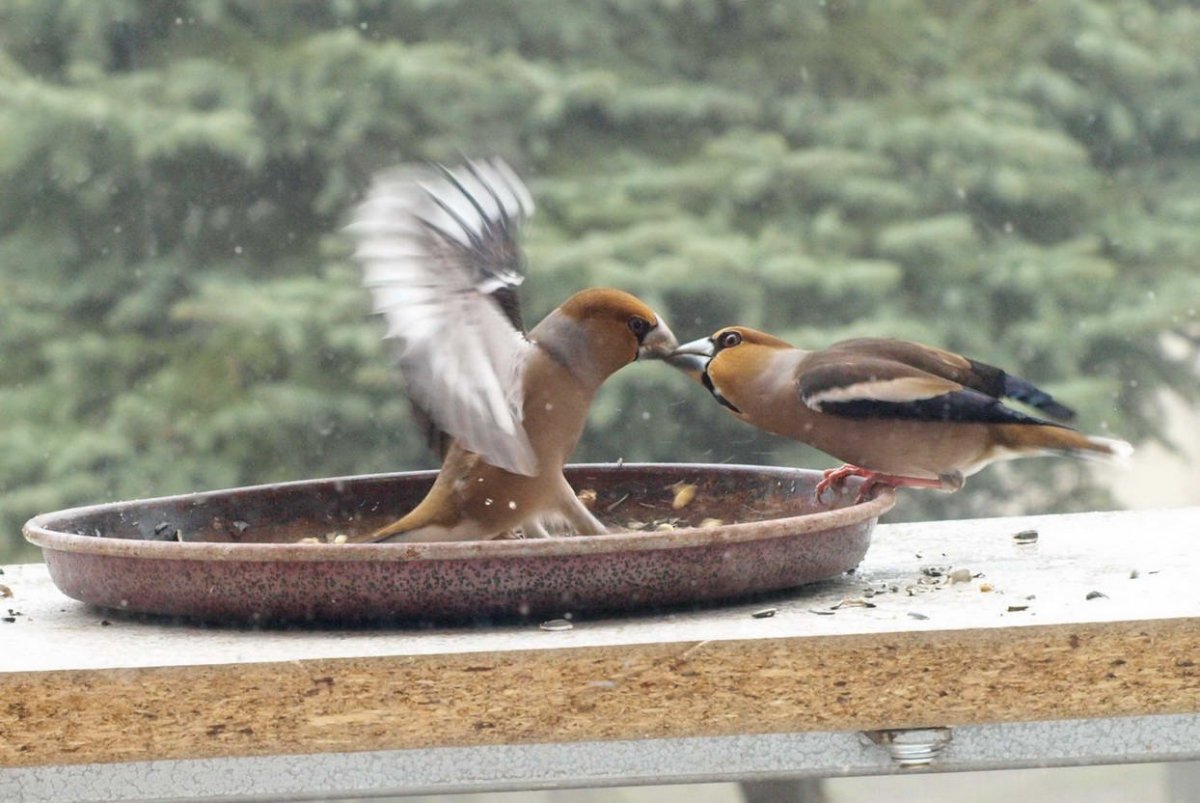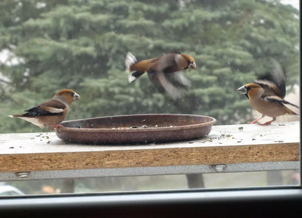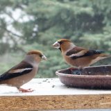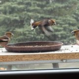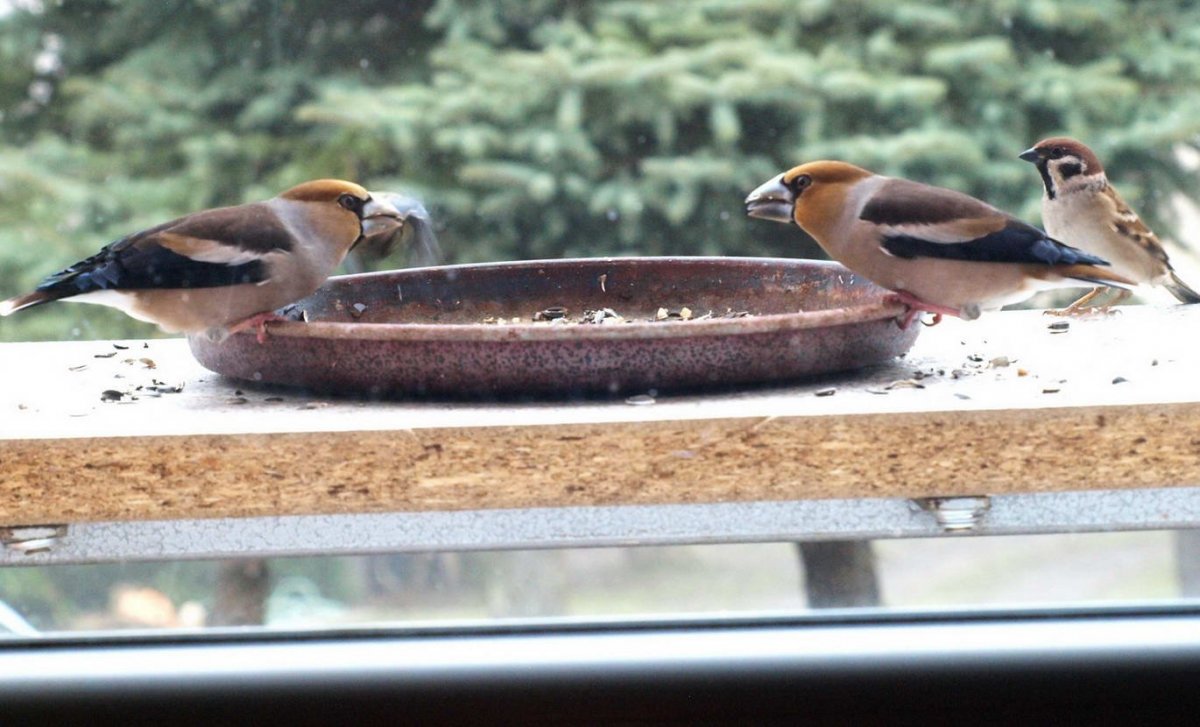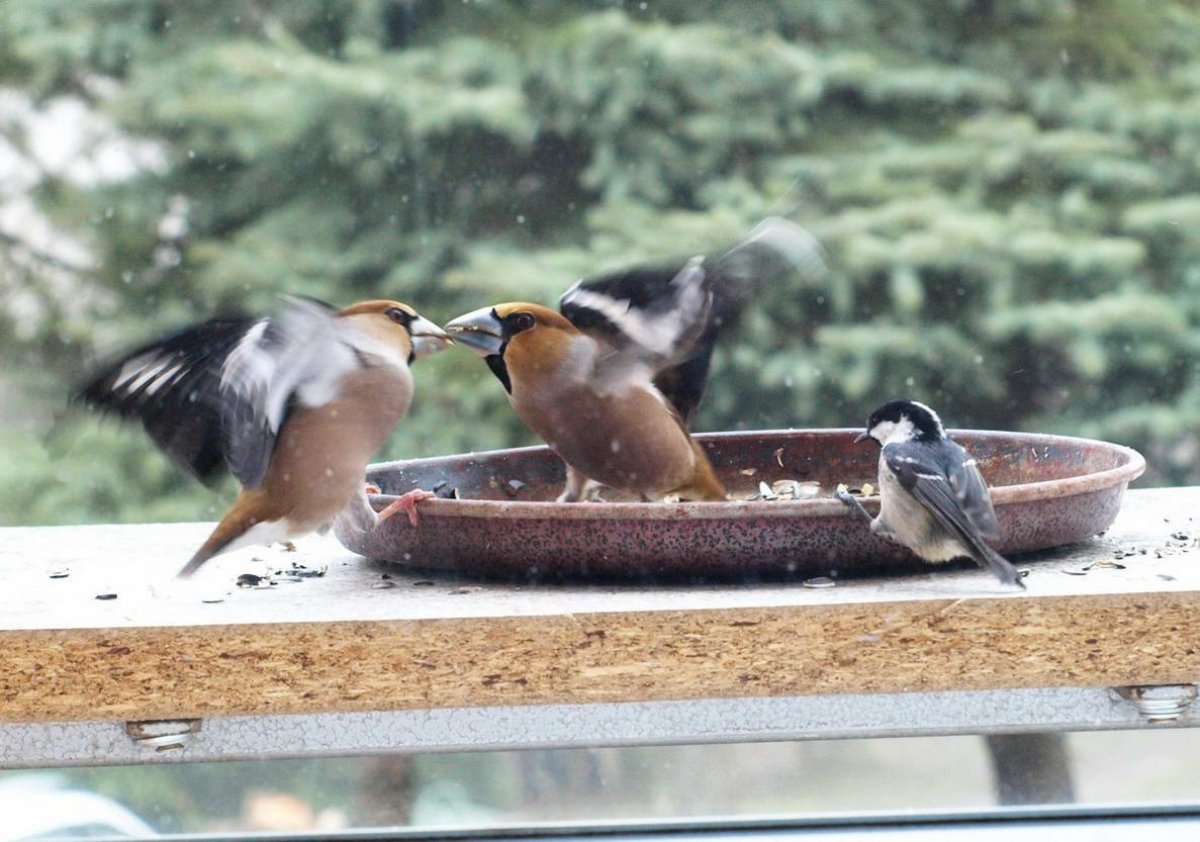 Omlouvám se za nehoubařský příspěvek, ale vzhledem k problémům s kolenem zatím do lesa nechodím. Takže jako správný důchodce krmím ptáčky. Před několika dny se k nám na zahradu slétlo hejno dlasků. Ale někteří se navzájem na krmítku nesnesou. Takže takto to za oknem vypadalo.