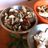 Byli jsme dnes na Mutkově. Praváků už moc nebylo, našli jsme dva obry a asi deset menších. Hodně kozáků březových, nějaké kováře. Podstatně míň bylo růžovek. Velcí praváci a kováři byli červiví. Kozáci hodně vykousaní. K obědu jsme měli houbové řízečky z praváků a z pýchavky...tu jsme včera dostali.