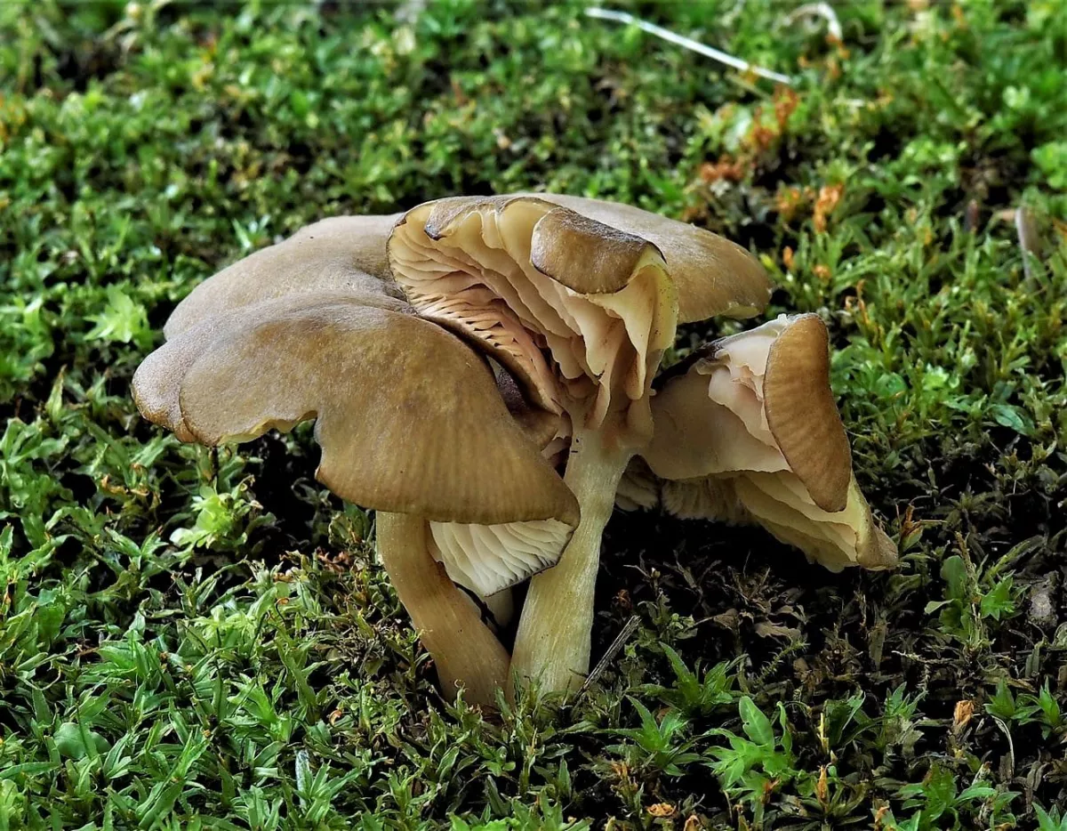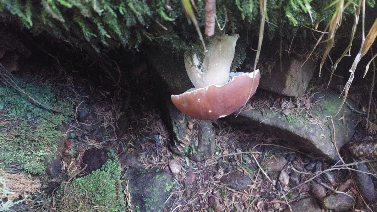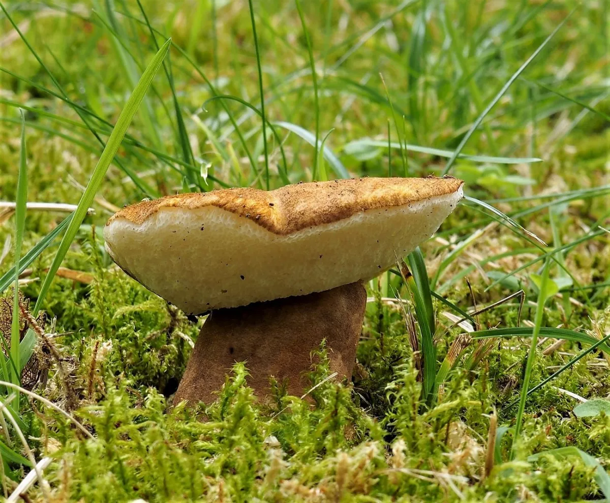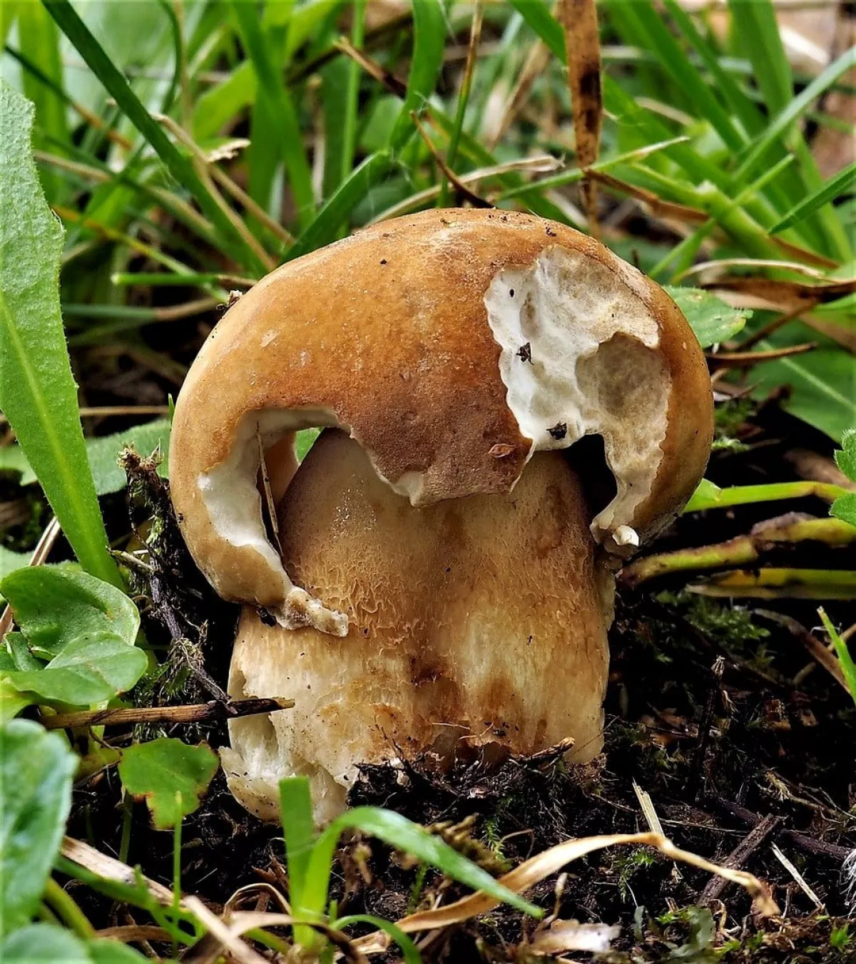 této houbě se z nějakého důvodu otočily lupeny vzhůru a povrch klobouku zůstal uzavřen uvnitř