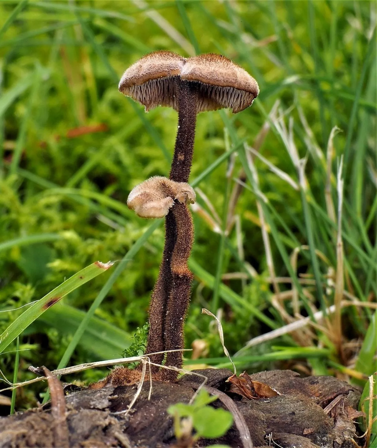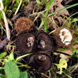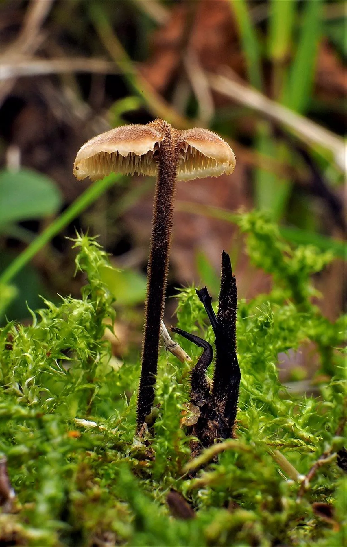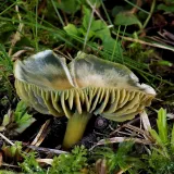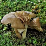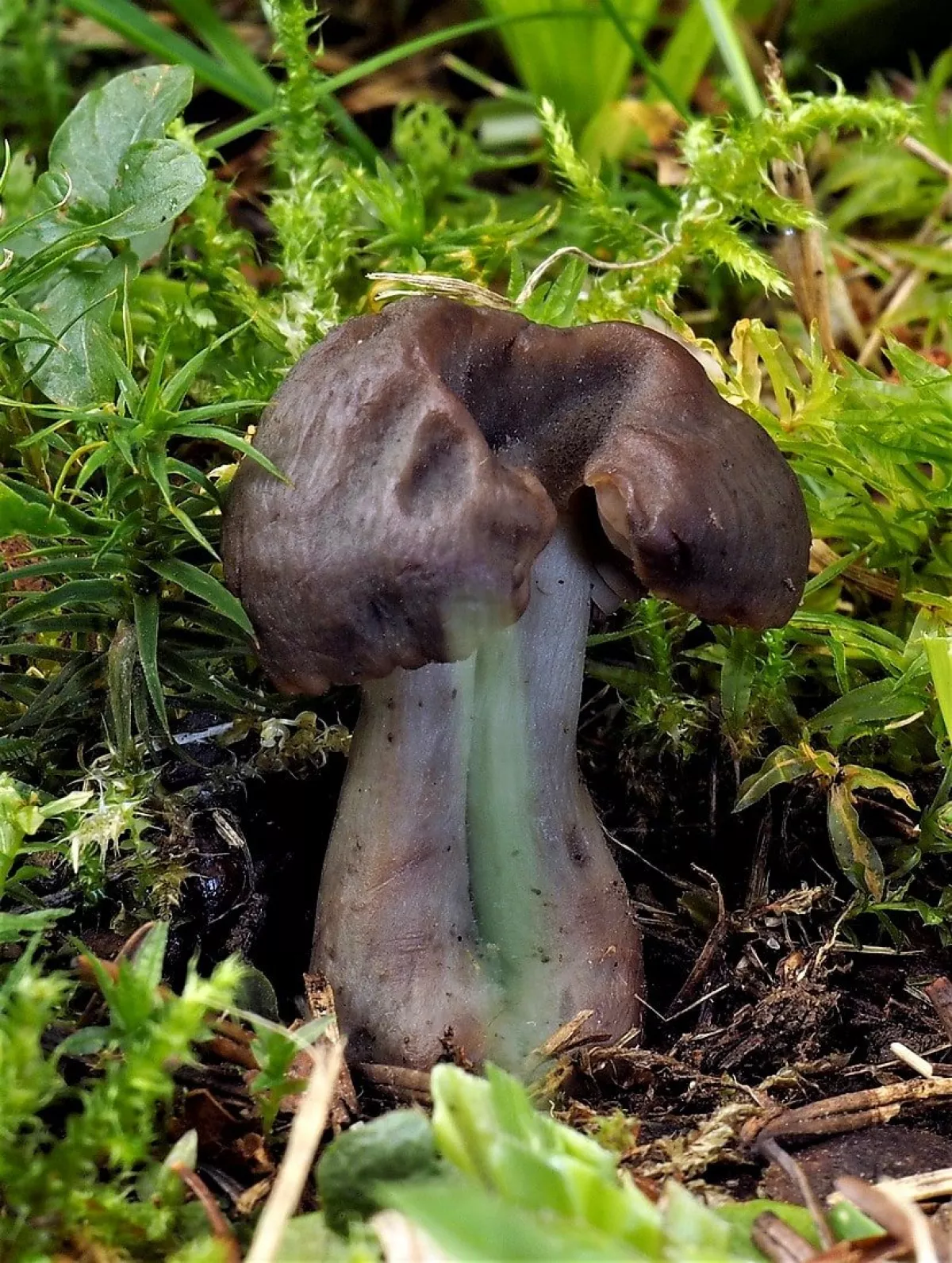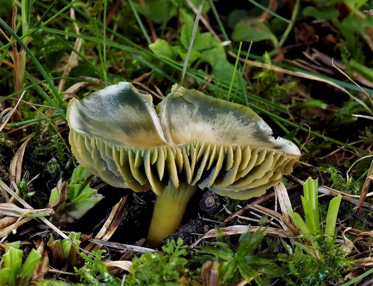 této houbě se z nějakého důvodu otočily lupeny vzhůru a povrch klobouku zůstal uzavřen uvnitř