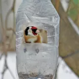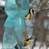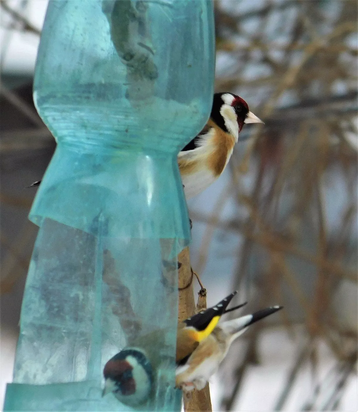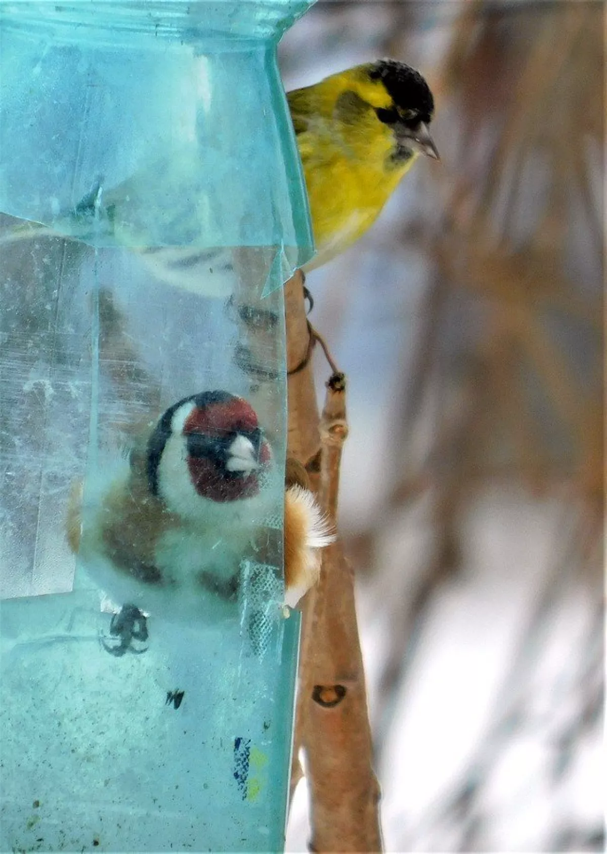 Čížci mi sem občas chodí,odhání sýkorky,ale stehlíci tu byli poprvé,přitom je kousek dál vídám.
