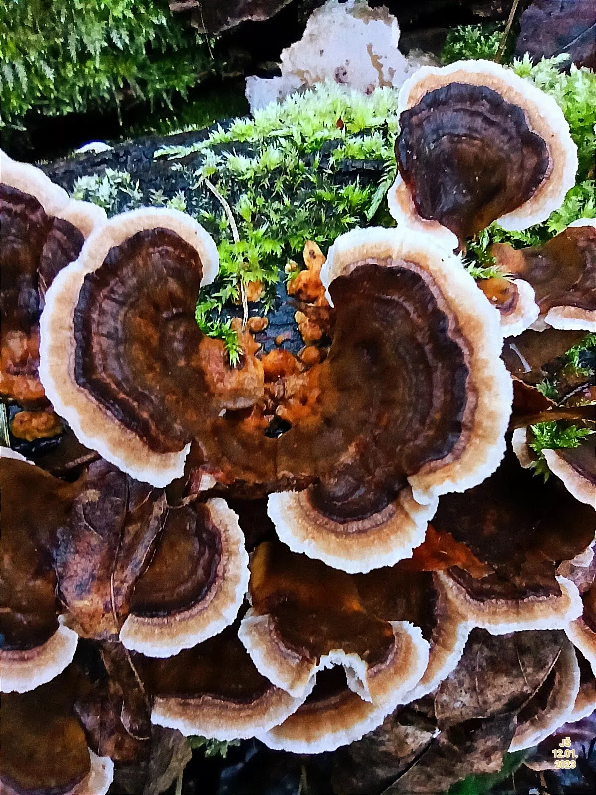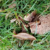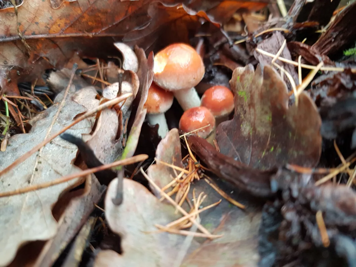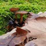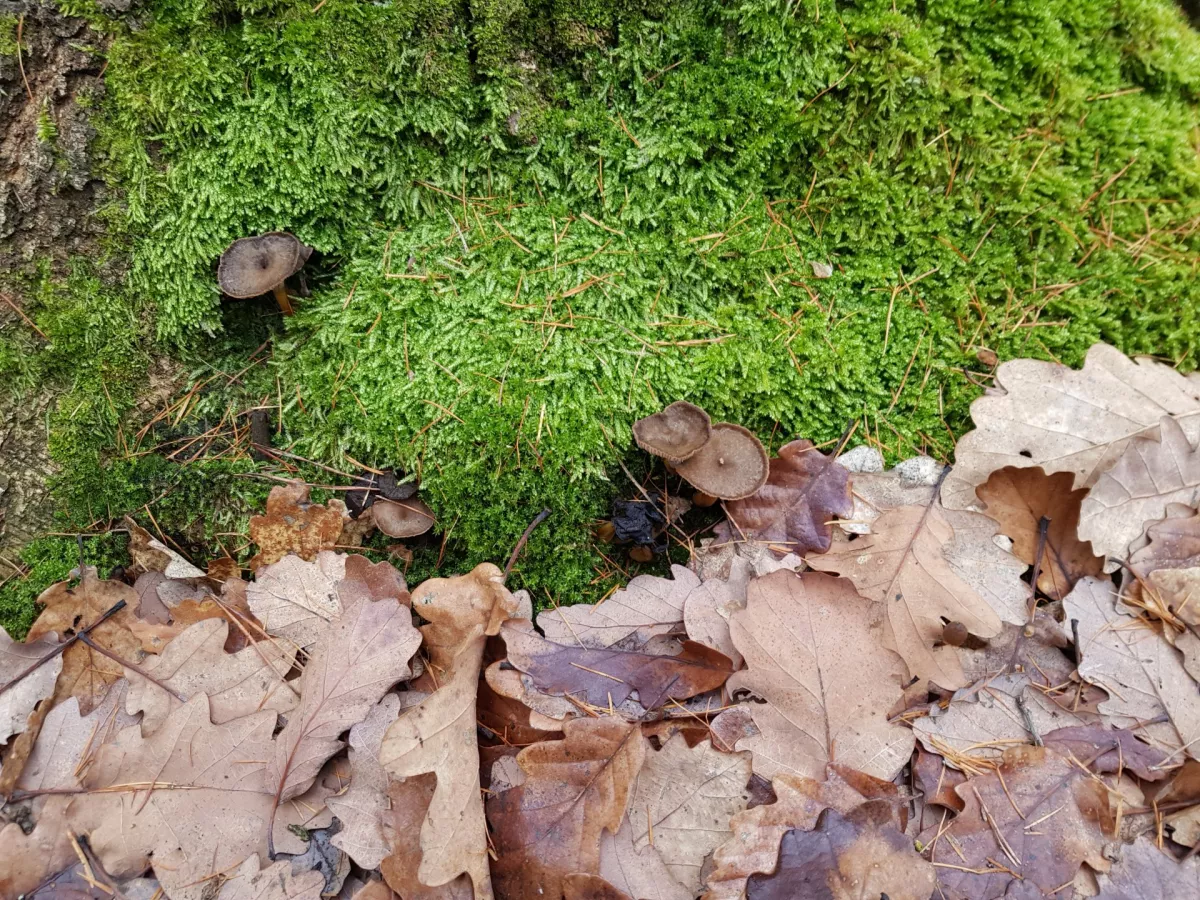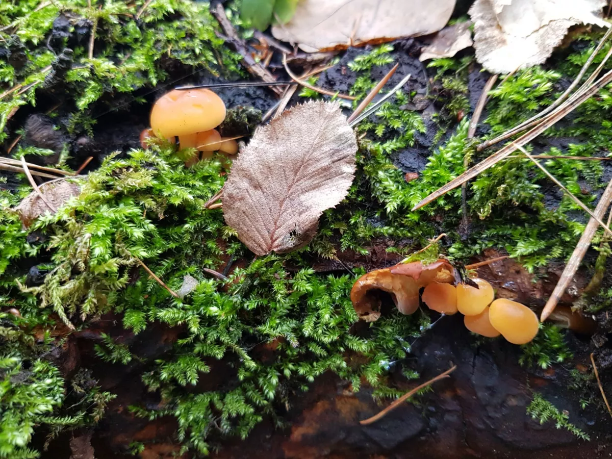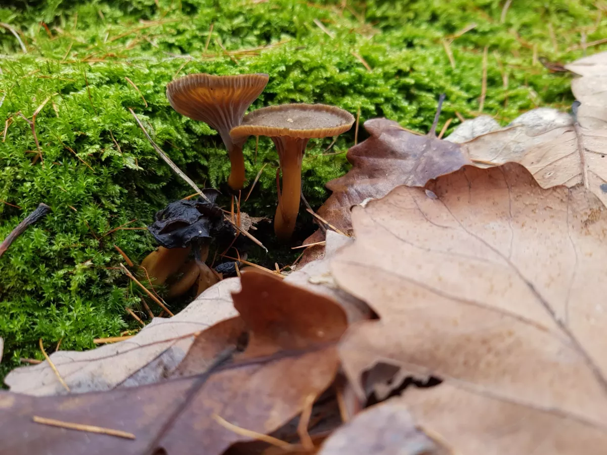 Dnešní fotky. Čerstvé třepenitky, penízovky a dva měsíce staré lišky nálevkovité a čirůvky dvoubarevné.
