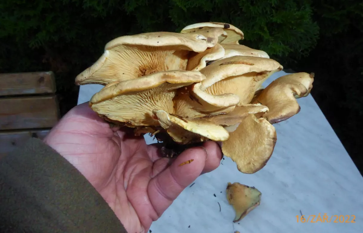 Dotaz, je to hlíva a pokud ano, jaká? Hlívu obvykle nacházím v zimním období a je šedomodrá. Tato je světle hnědá, trochu do žluta