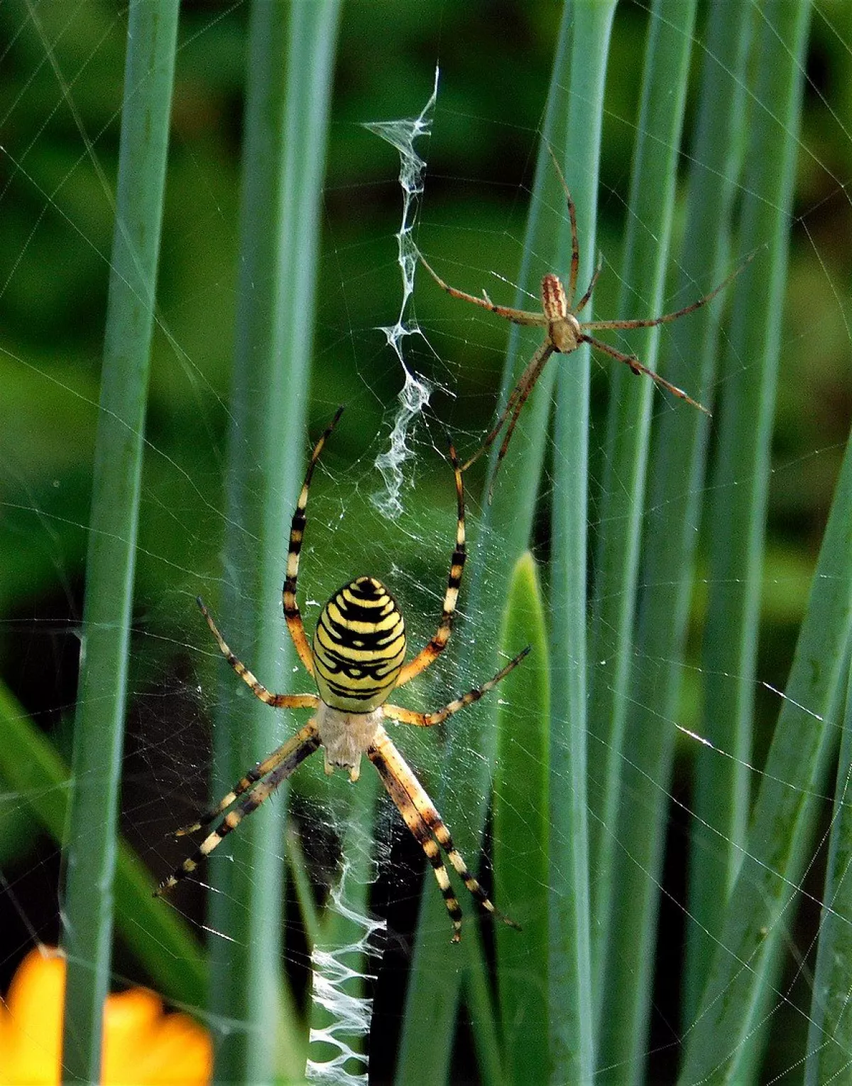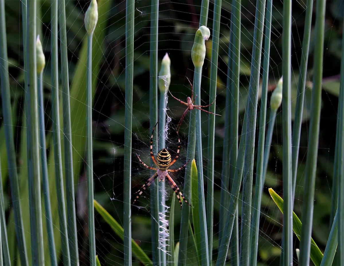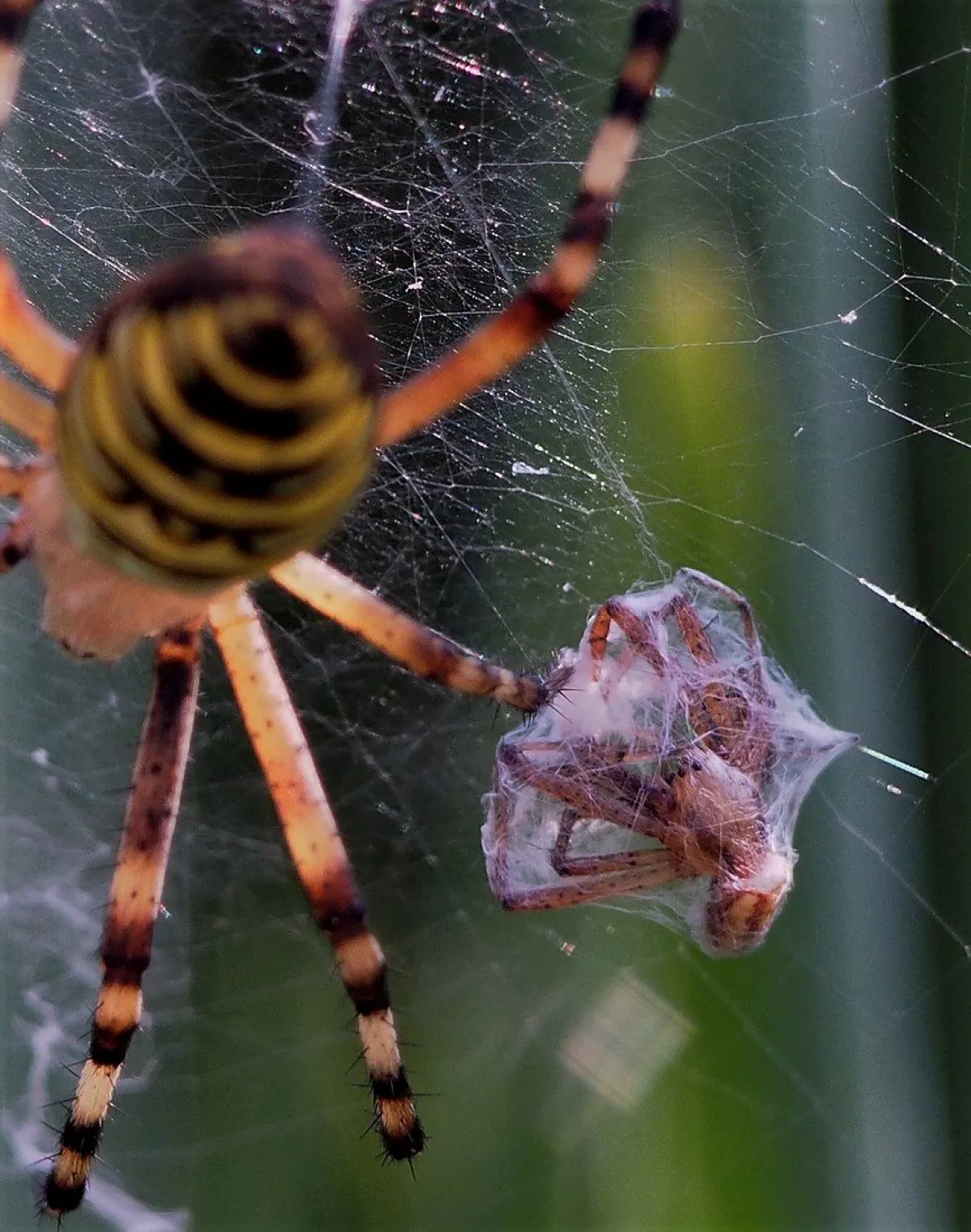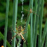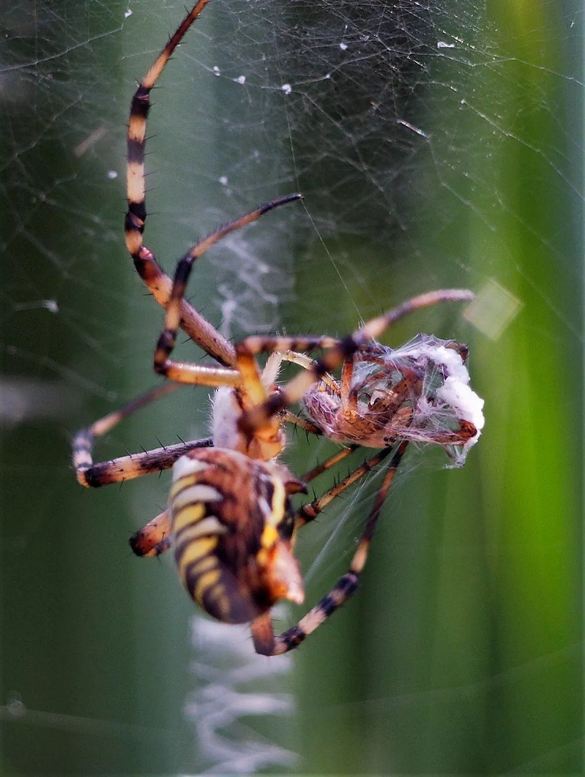 A taková to byla velká láska.Ráno jsem šel do stodoly kolem pažitky a zdálo se mi bez brýlí,že tam je sameček.Honem brýle, jeden foťák,pak druhý a už to cvakalo.Pak sameček začal obtěžovat samičku,čekal jsem,co se bude dít.Asi si ani nic neužil a samička to ukončila výpad.Během několika vteřin z něj byl balíček do "spížírny".Jenže než jsem stáhl fotky,tak už ho asi vysála a odstřihla,už tam balíček nebyl.Dělá to tak pokaždé,minule tam měla zabalené 4 včelky a postupně je odstranila.Asi jsem měl pořádnou kliku.