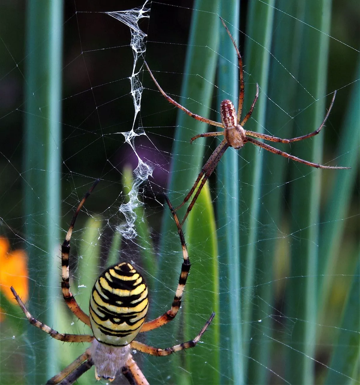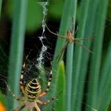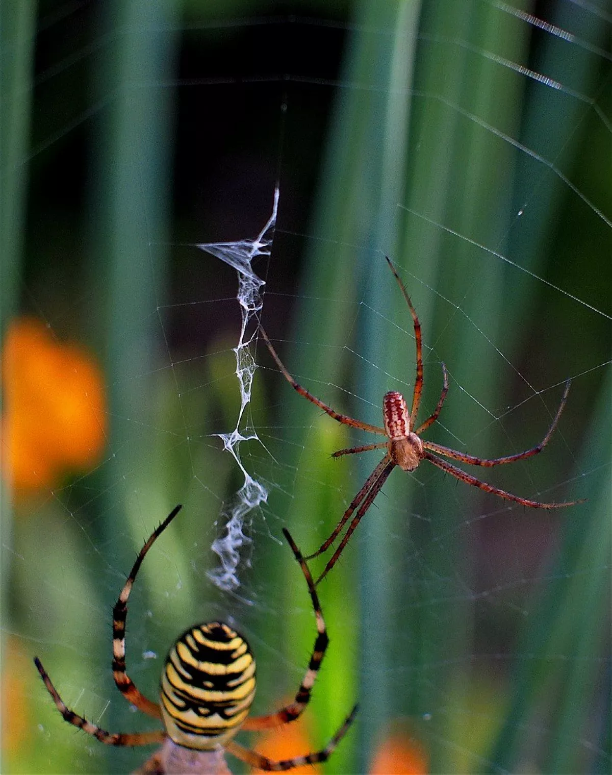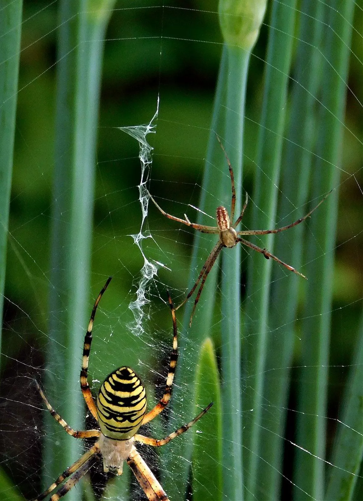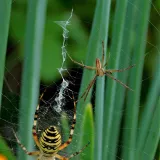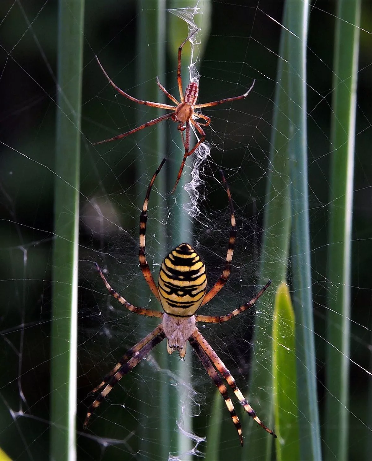 A taková to byla velká láska.Ráno jsem šel do stodoly kolem pažitky a zdálo se mi bez brýlí,že tam je sameček.Honem brýle, jeden foťák,pak druhý a už to cvakalo.Pak sameček začal obtěžovat samičku,čekal jsem,co se bude dít.Asi si ani nic neužil a samička to ukončila výpad.Během několika vteřin z něj byl balíček do "spížírny".Jenže než jsem stáhl fotky,tak už ho asi vysála a odstřihla,už tam balíček nebyl.Dělá to tak pokaždé,minule tam měla zabalené 4 včelky a postupně je odstranila.Asi jsem měl pořádnou kliku.