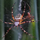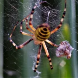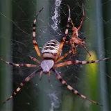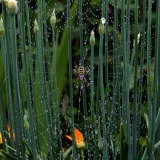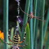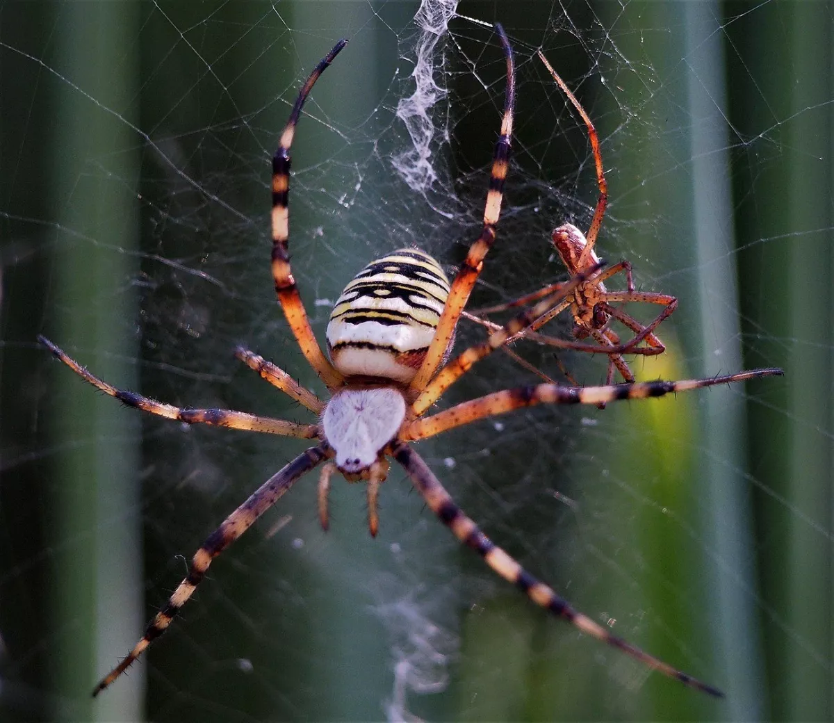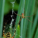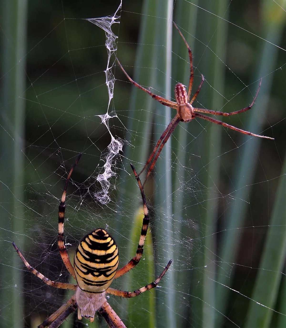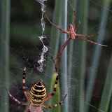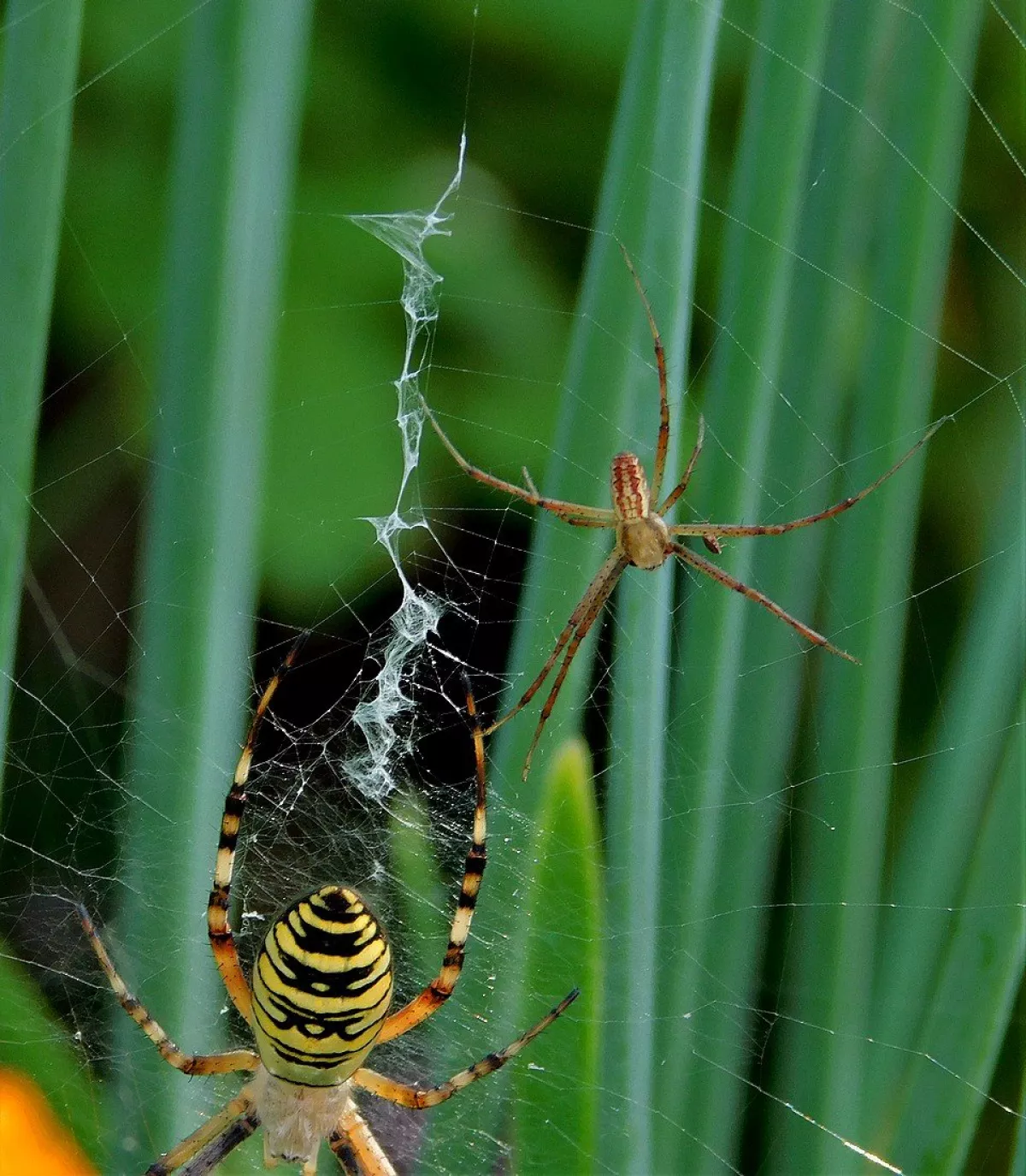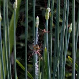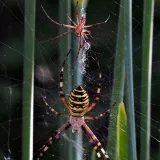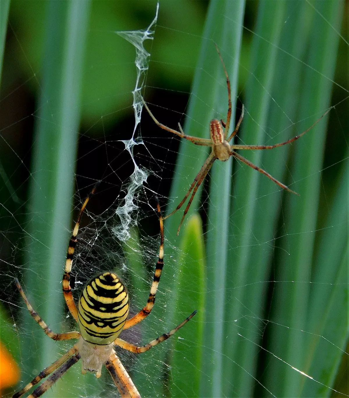 A taková to byla velká láska.Ráno jsem šel do stodoly kolem pažitky a zdálo se mi bez brýlí,že tam je sameček.Honem brýle, jeden foťák,pak druhý a už to cvakalo.Pak sameček začal obtěžovat samičku,čekal jsem,co se bude dít.Asi si ani nic neužil a samička to ukončila výpad.Během několika vteřin z něj byl balíček do "spížírny".Jenže než jsem stáhl fotky,tak už ho asi vysála a odstřihla,už tam balíček nebyl.Dělá to tak pokaždé,minule tam měla zabalené 4 včelky a postupně je odstranila.Asi jsem měl pořádnou kliku.