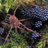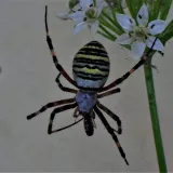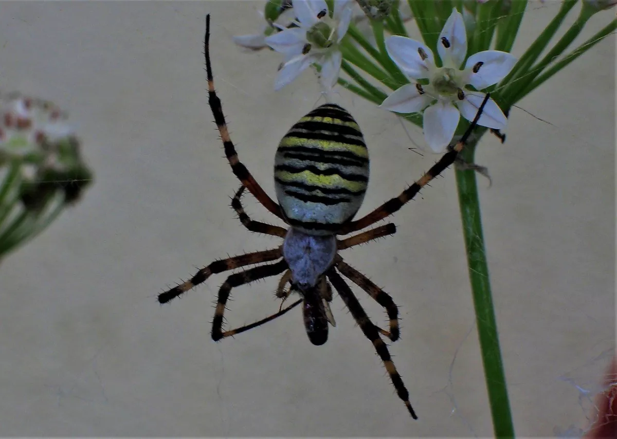 Křižák pruhovný se ze skalky dostal až pod okna a obsadil pažitku.Zrovna něco večeřel.Bylo to proti světlé zdi a ve větru,tak to líp nešlo,chybí i barvy.