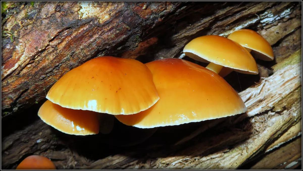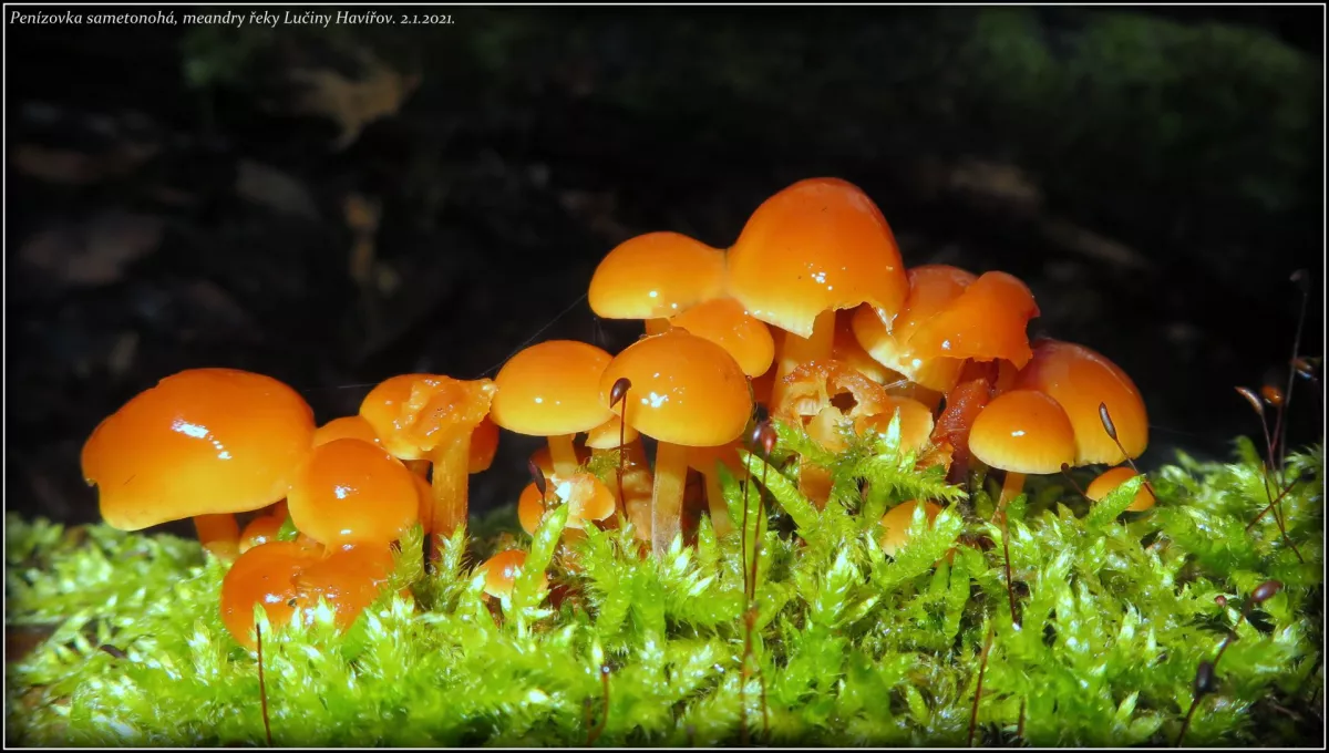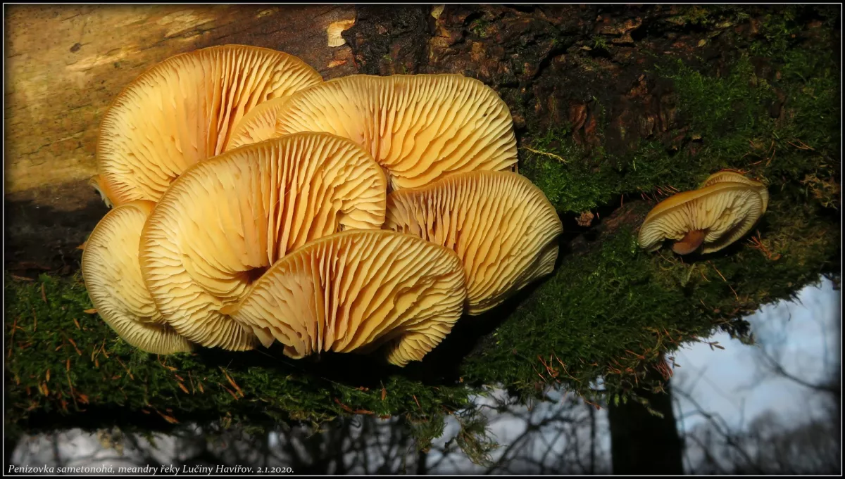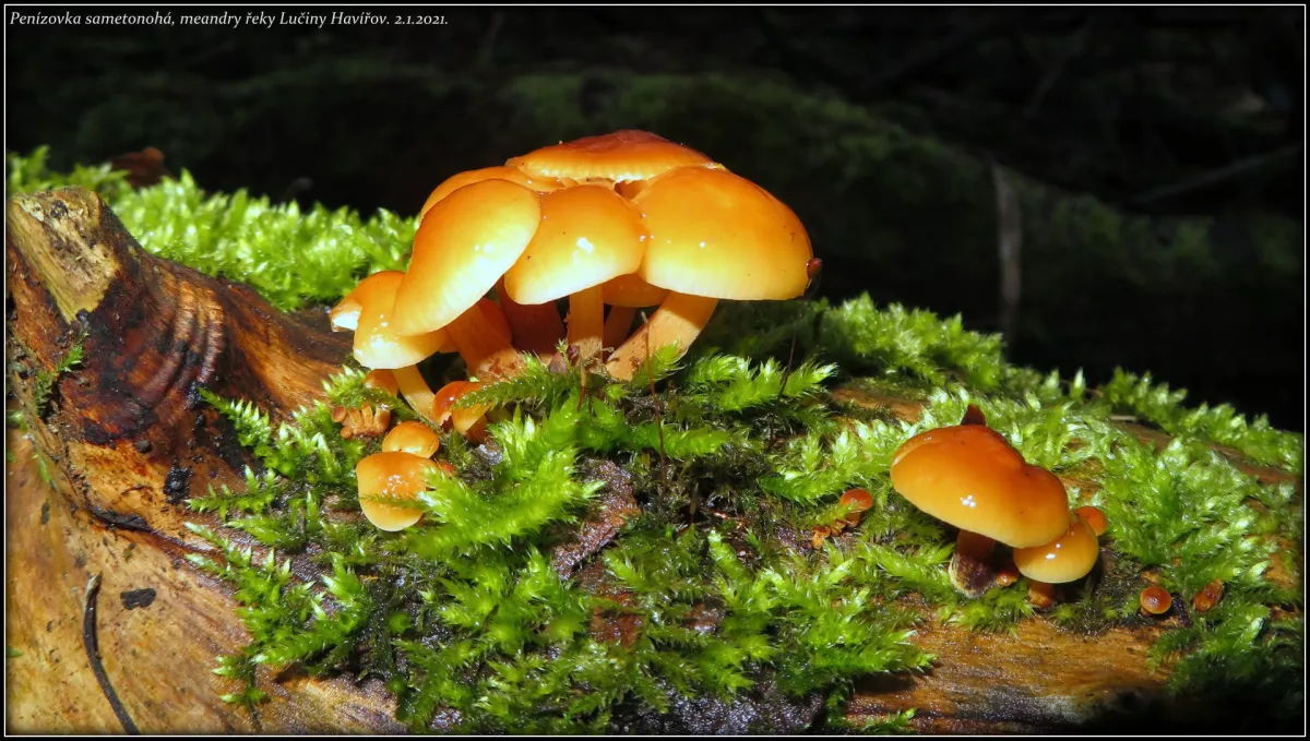 penízovka sametonohá, ušíčko černé 2x, dřevomorka zlatá, dřevomorka lesní, trepkovitka, brvenka asi Hahnova, voskovičky (?)