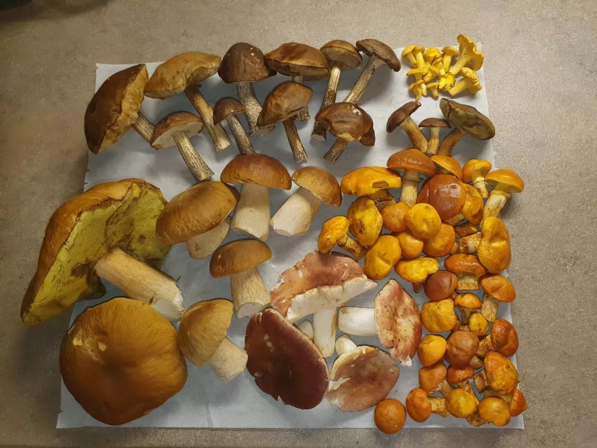 hřib smrkový 2x, hřib nachovýtrusý, liška nálevkovitá, ryzec černohlávek, muchomůrka slámožlutá, vláknice, kuřátka, pýchavka horská, pýchavka obecná, bělochoroš pýchavkovitý