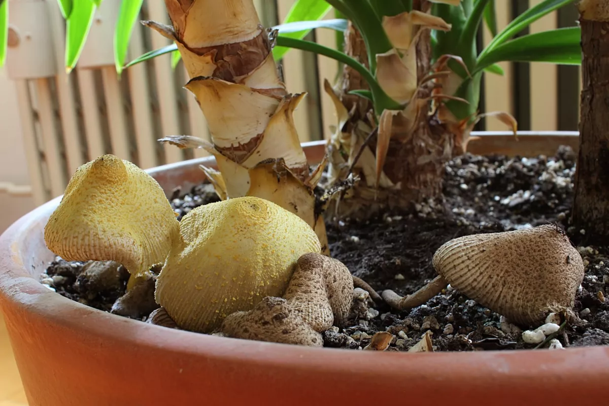Také mi toto vyrostlo ve květináči (před 15 lety). Prý se podhoubí přiveze až ze země původu květiny . Co mne ale překvapilo, ze mi tyto nebo velice podobné houby vyrostly na několika místech na zahradě. Možná globální oteplování ....