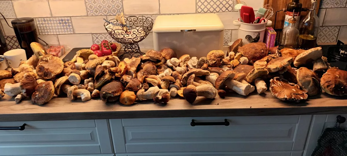 2 hod. v Rudě. Rostou pomístně hlavně hřiby a klouzci. Celkem spokojenost.