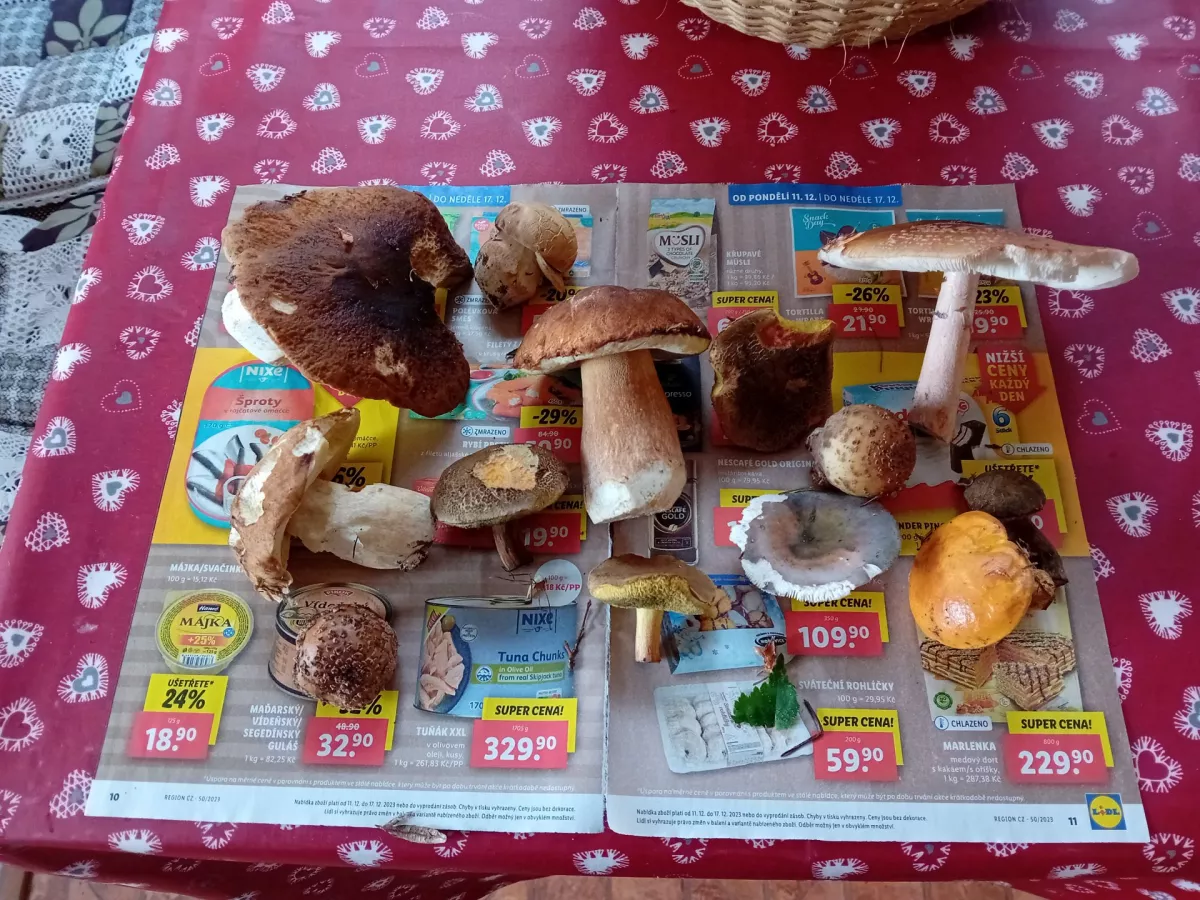 Po první hodině v lese se mi honily hlavou myšlenky, jak tady budu zase “mňoukat”, že jsem nic nenašel nebo že nic neroste. Záchrana přišla v nálezu odřezků. Začal jsem šmejdit kolem a sláva - bingo v podobě parádního smrkáče. Nález v mladé smrčině. Od té chvíle jsem zapomněl na bolavé koleno, kyčel a ploténky a začal se vrhat do houštin. Výsledek viz foto. Ve vysokém jsem našel masáky a klouzky. Prima den, s nebo bez hub, hlavně ať je fajn. HT