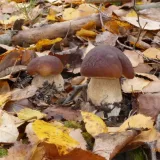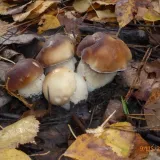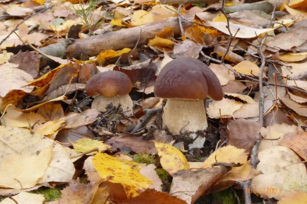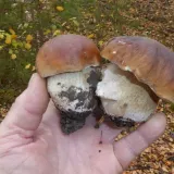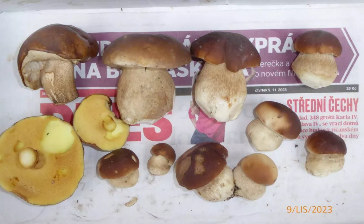 Křivoklátské lesy-Rakovnicko. I když jsem byl včera rozhodnut, že končím, dnes jsem si vzpomněl na jedno místo, kde jsem dlouho nebyl. A dobře jsem udělal. Přesně na stejném místě, kde jsem minulý rok v říjnu našel skupinku deseti hříbků, byla tentokrát skupina "pouze" čtyř malých hříbečků. Kdyby nebyly hlášeny noční mrazy, nechal bych je tam a došel bych si pro ně za dva dny. Roste mnoho druhů hub, často i dva druhy těsně vedle sebe.