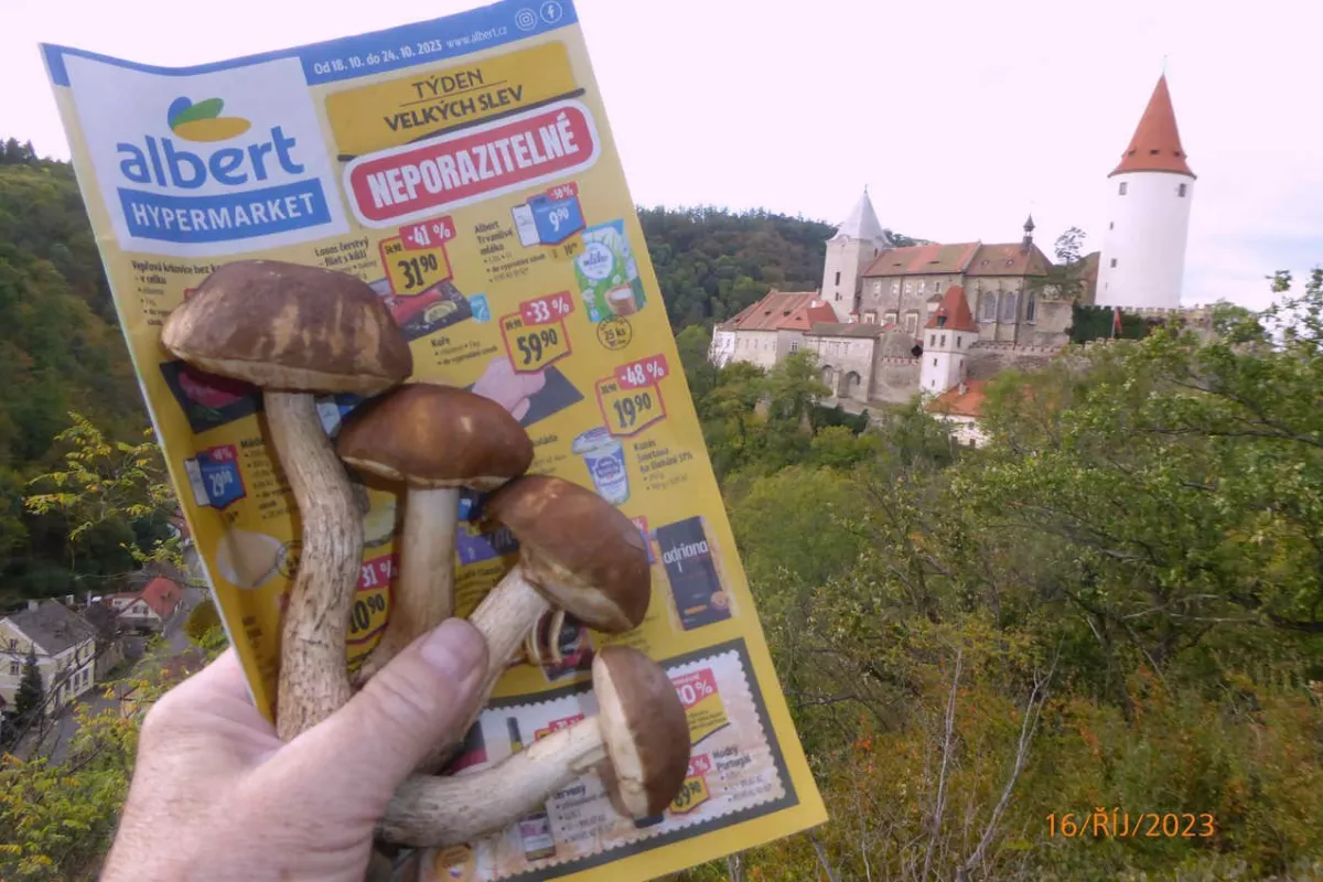 Ty asi nevíš, jak to tady funguje! Bez fota hub, místa a letáku z Penny či z Alberta, nemůžeš vydat příspěvek do světa! Podívej na legendárního Jindřicha, ten ví jak nebýt za kokota. Ten leták z Penny k houbám přiloží a hned všichni vědí, že to zas tak nehoří! Někomu se z toho sice ztopoří, avšak my zkušení houbaři, víme, že když se v lese zapaří porostou jak loni v září. 😁 Na plné koše to letos v Brdech není, to je jen tvé poblouznění.