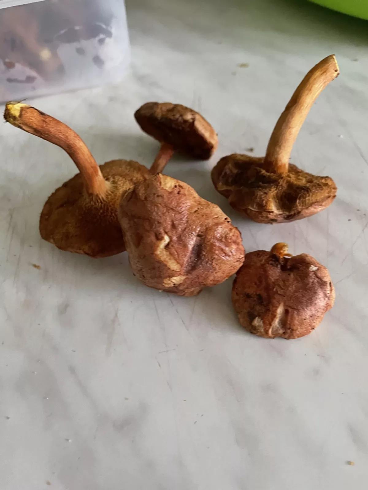 Houby jsou unavené, ale je to klouzek kravský. Syna do lesa raději nepouštějte, když sbírá houby, které nezná a zřejmě je pak nosí po kapsách. Jinak houba je jedlá, gumovitá, nevalné kvality.