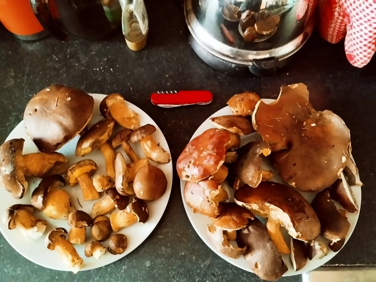 Čas vypadá strašidelně, ale konečně byl důvod — mohl jsem si pořádně užít sbírání i čištění hub. Jak to shrnout… V nízkých smrčinách jsem nenarazil prakticky na nic, ve vysoké smrčině se tu a tam objevil hnědák. I když někteří vypadali na první pohled pěkně, řada z nich už byla chycená. Stejně jako minulý týden, nejlepší úlovek mě čekal ve vysokém, ne příliš hustém smíšeném lese — modříny, smrky, borovice… místa, kde jsem si mohl vybírat ty nejhezčí “soudečky”. Houby zdravé, pevné, nenapadené. Dnes to bylo sice druhově jednotvárné, ale parádní! Možná vyrazím i zítra — “dorostu” bylo dost. Prima den s nebo bez hub, hlavně ať je fajn. HT