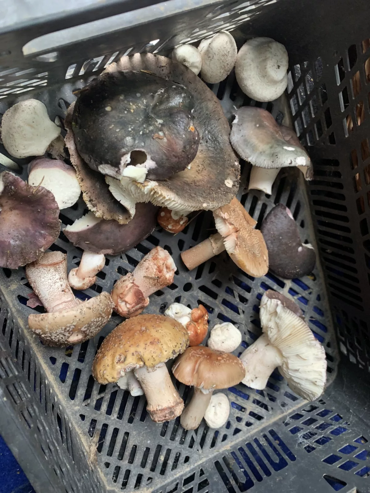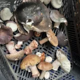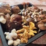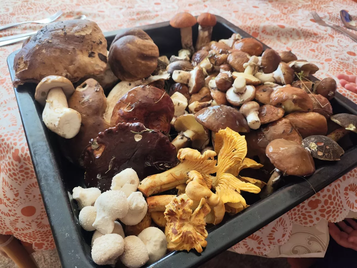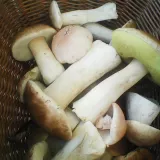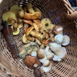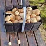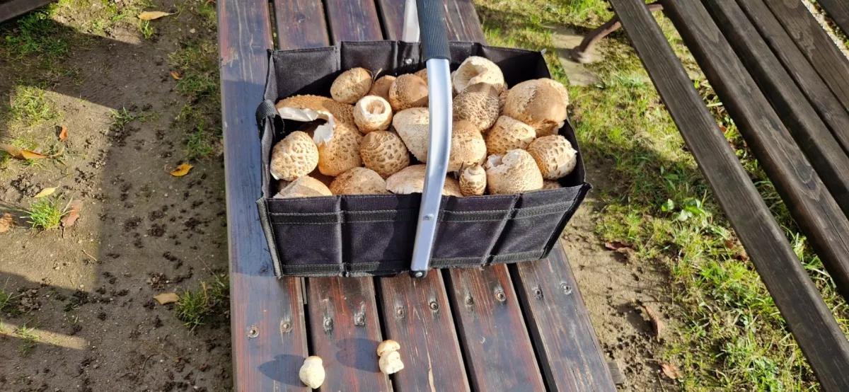 Za 2 h v smíšeném lese u Ludvíkova :13 hřib smrkový, 17 bedla vysoká 11 klouzek modřínový a 8 liška.